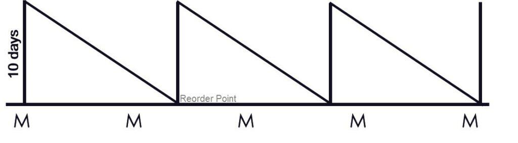 On the first Monday, a truckload is purchased, which is 10-day supply. Those goods want to deplete down and replenish together in about 10 days, which would be approximately the following Thursday.