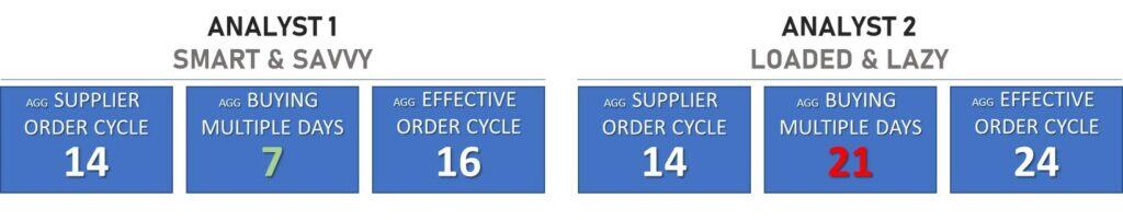 Take a look at the Inventory Scorecards of Analyst 1 and Analyst 2. In the end, Analyst 1 replenishes 16 days, while Analyst 1 replenishes 24 Days.