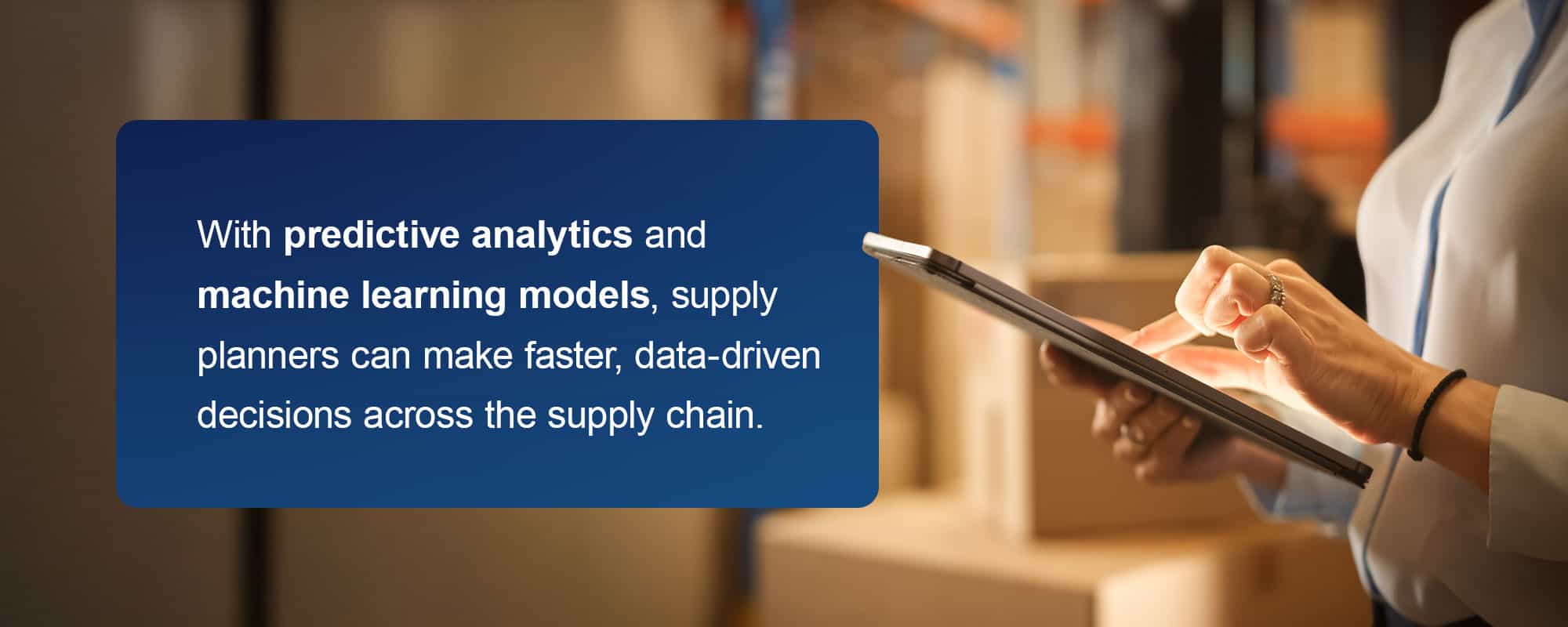 - Better demand forecasting: Incorporating AI also allows businesses to automate complex processes and identify patterns. With predictive analytics and machine learning models, supply planners can make faster, data-driven decisions across the supply chain.
