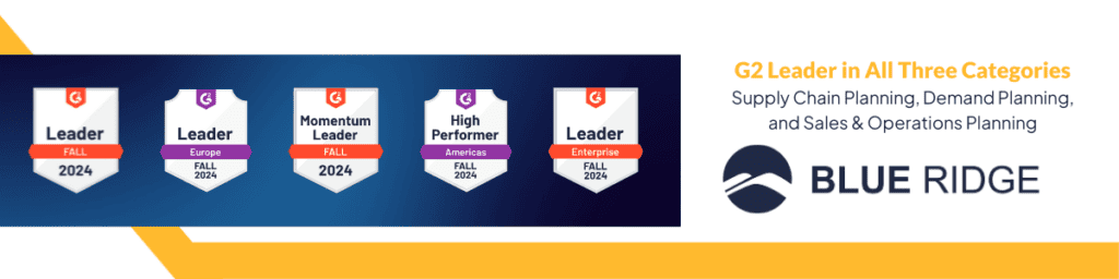 Blue Ridge is excited to announce that we have been awarded several significant badges in the G2 Fall 2024 Reports, showcasing our commitment to excellence in Supply Chain Planning, Demand Planning and Sales & Ops Planning.